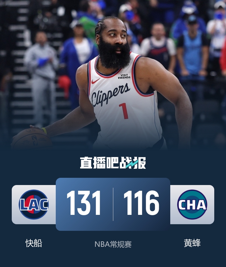 快船(5-11):哈登55分3板7助、祖巴茨18分9板6助、桑德斯11分1板2助、洛佩斯11分1板1助、科林斯10分7板、巴图姆9分3板2断、克里斯蒂8分9板、邓恩6分2板6助、保罗3分4板8助、尼德豪泽2板