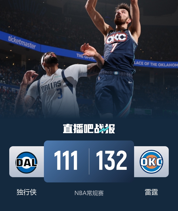 雷霆(22-1):亚历山大33分5板6助、杰伦·威廉姆斯15分8板5助、霍姆格伦15分8板1助、华莱士11分4板1助、维金斯11分2板3助、肯威10分1板3助、卡尔森9分6板3助、米切尔9分2助、吉昂7分1板1助、巴恩海泽5分1板2助、杰林·威廉姆斯4分3板3助、扬布拉德3分4板